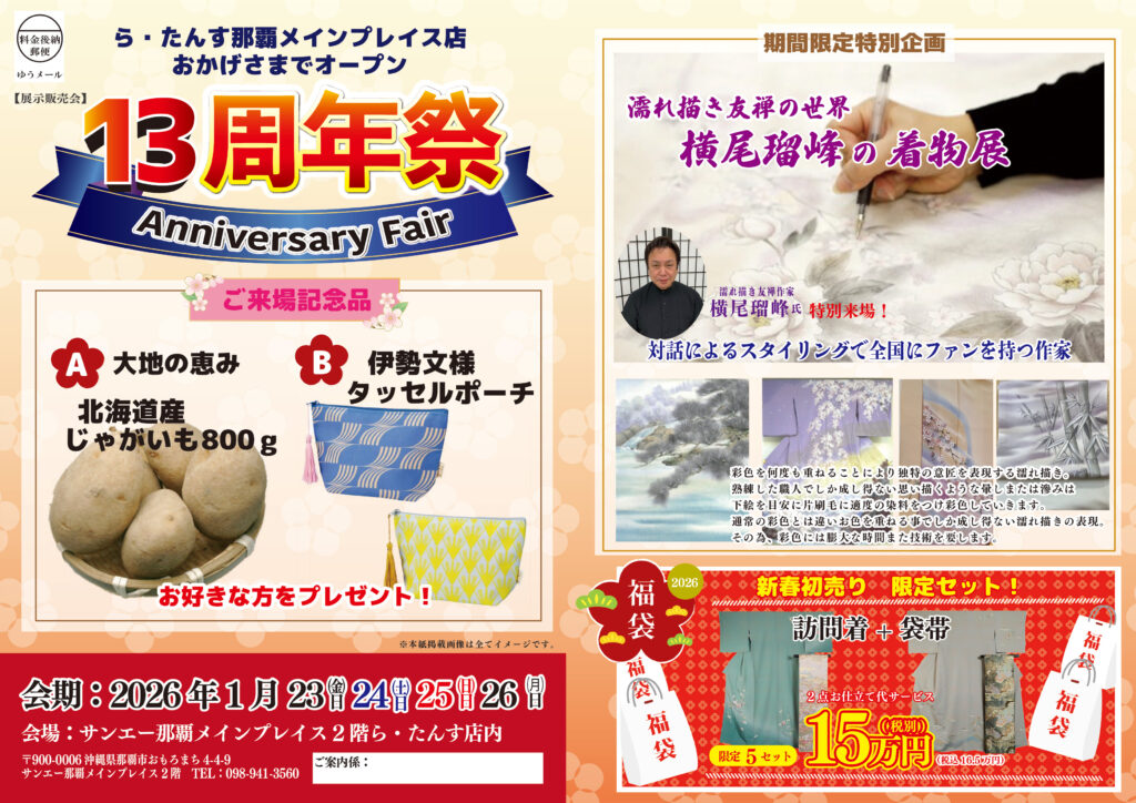 2024年9月24日 / 最終更新日 : 2026年1月19日 ヤマノホールディングス和装宝飾事業本部 イベント 最新イベント情報【ら・たんす那覇メインプレイス店】 【1月】13周年祭 皆様のご来場、心よりお待ちしております! ら・たんす那覇メインプレイス店098-941-3560