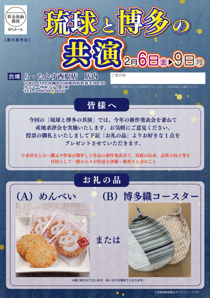 2024年10月4日 / 最終更新日 : 2026年1月29日 ヤマノホールディングス和装宝飾事業本部 イベント 最新イベント情報【ら・たんす西原店】 【2月】琉球と博多の共演 【2月】感謝一番祭 皆様にお会いできますことを楽しみにしております! ら・たんす西原店098-882-0056